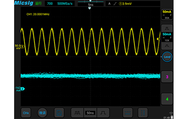高频交直流电流探头对于测量20M以上的信号依然游刃有余。(图中CH1黄色波形)